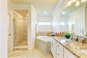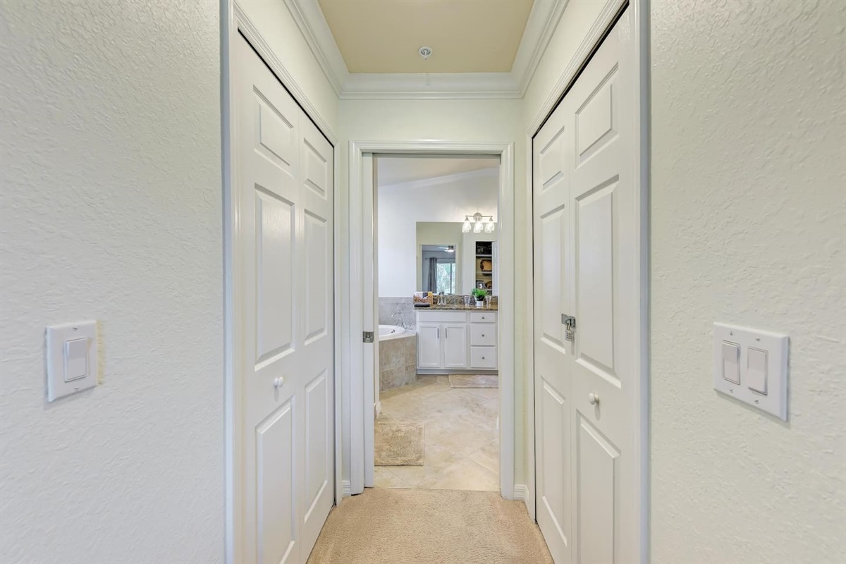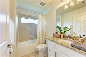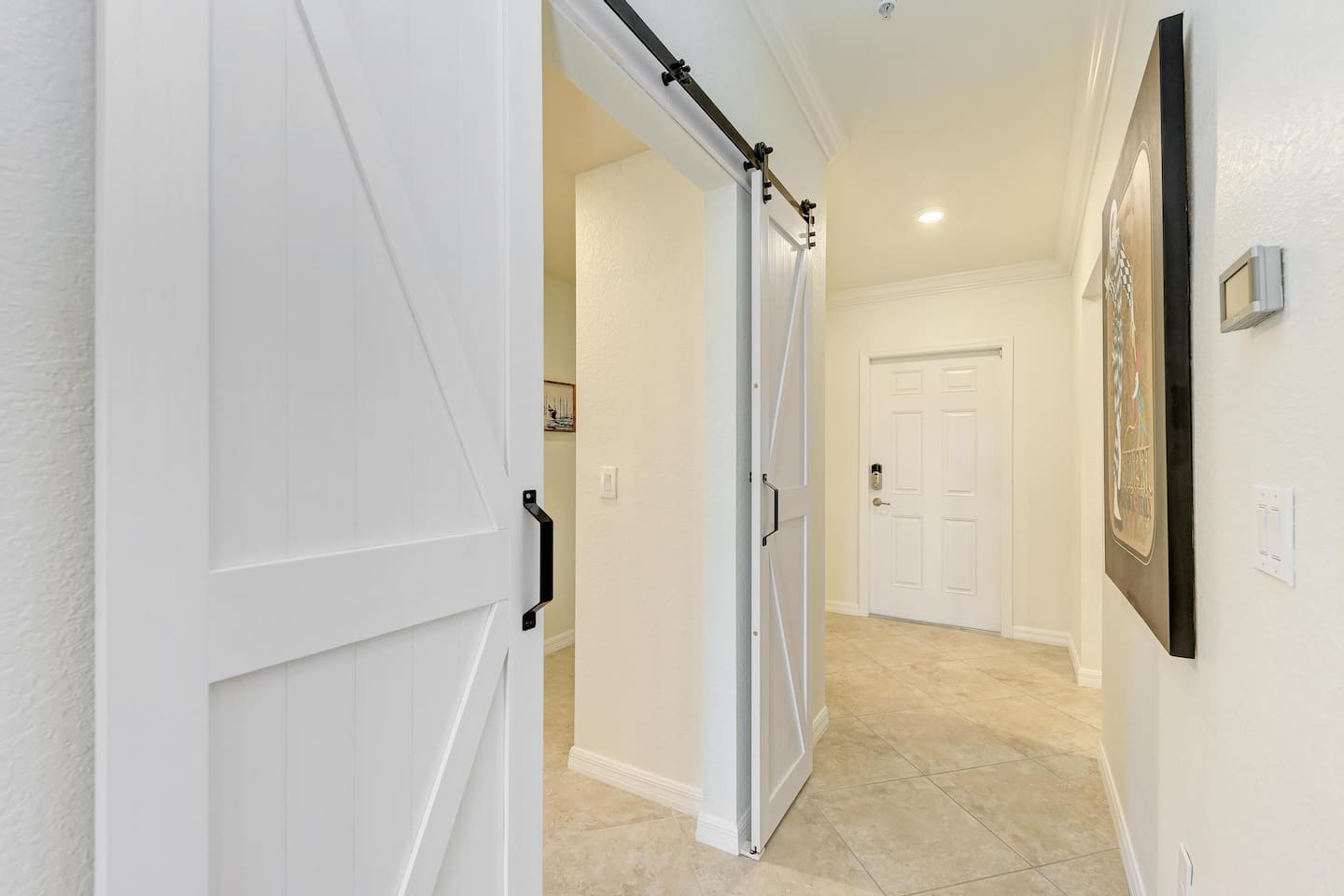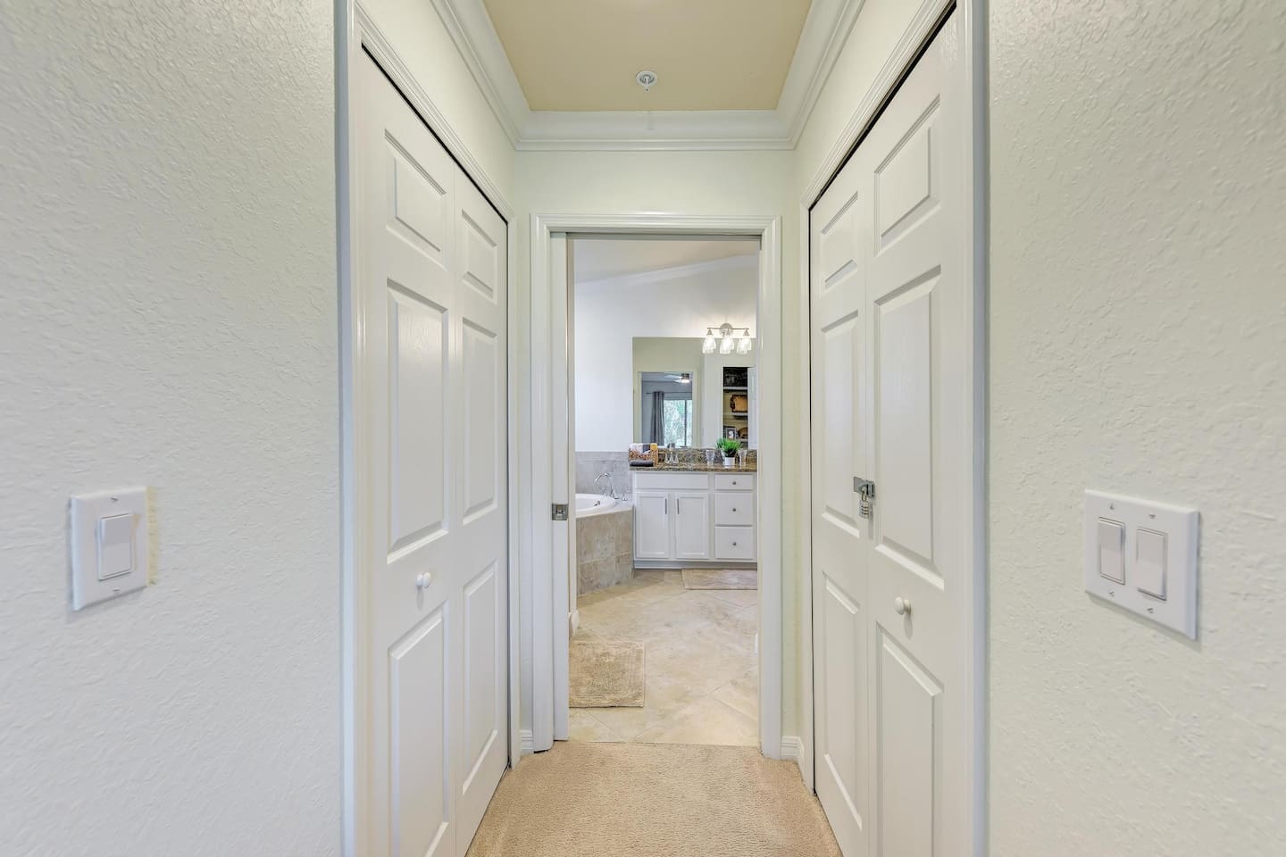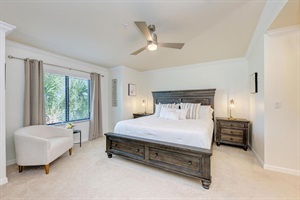 Wake up to serene views of the golf course and swaying palms from this spacious main bedroom. Featuring a king-size bed with two nightstands. A dresser provides good storage, and 40" TV. Nestled by the window, a reading chair invites you to unwind.