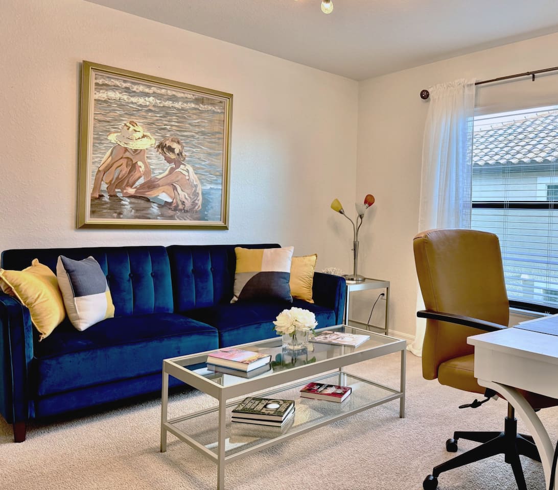 A cozy living room with a gray couch, yellow accent chairs, wooden coffee table and abstract paint above the table.