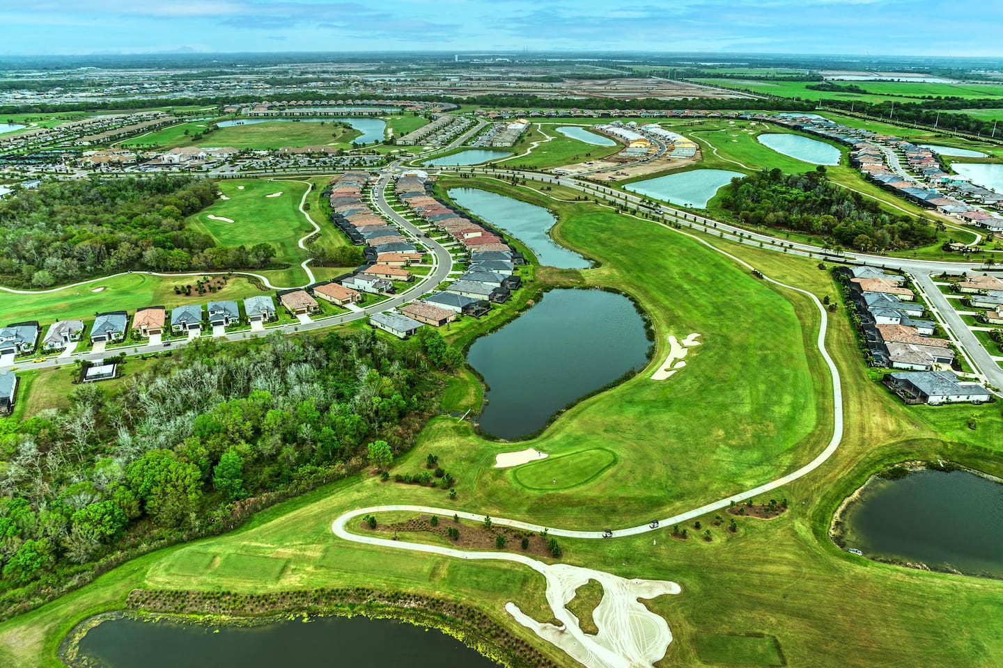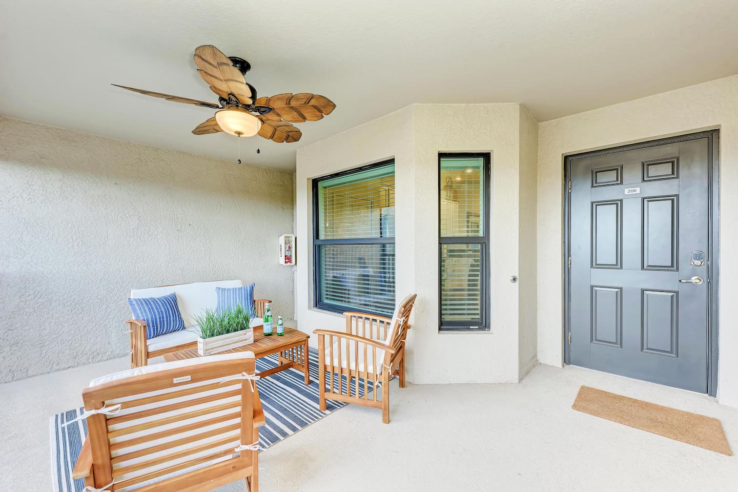 Cozy screened lanai with rocking chairs, round table with 4 chairs. The view outside shows palm trees, a golf course, and a lake.