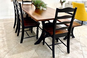 A Daning area with a Acacia wood table, 4 chairs and one bench that can seat up to 7 people. Abstract painting on the wall, light-Colored tiles and Off-white walls.