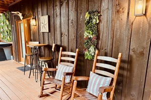 Cozy porch with rocking chairs, bistro table, and greenery wreath.