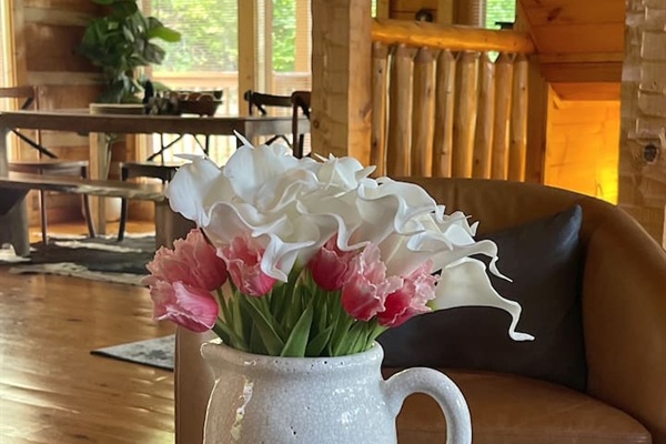 Cabin bedroom with a comfy King bed, colorful pillows, wooden walls, and a mounted TV. Red flowers on the dresser add a pop of color.